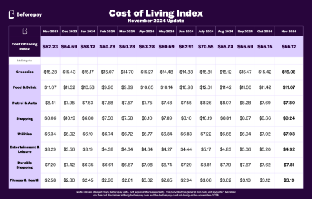 The November 2024 Beforepay Cost of Living Index offers insights derived from over 430,000 users, providing a detailed view of consumer behaviour across essential and discretionary spending categories.