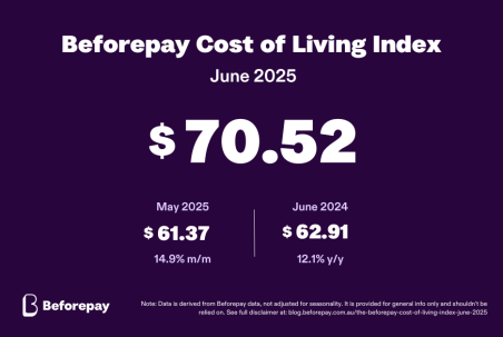 Sydney, Australia – The Beforepay Cost of Living Index rose 14.9% in June to a daily average spend of $70.52, marking the sharpest monthly increase recorded this year. While rising costs played a role, the standout driver was a 32.2% surge in durable shopping, as Australians appeared to take advantage of end-of-financial-year (EOFY) sales and tax-time spending opportunities. On a yearly basis, the Index rose 12.1% from $62.91 in June 2024.